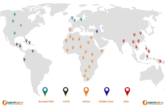 Talent Fusion has worked on a variety of grant opportunities such as USAID, Global Fund, Bill & Melinda Gates Foundation, UN, WFP and ECHO with funding budgets ranges from USD$2 million to USD$150 million depending on the type of programme.Talent Fusion also supports clients with onboarding frameworks, retention strategies, and performance alignment tools to ensure long-term success. Their approach combines data-driven recruitment with human-centered design, making them a trusted partner for organizations navigating high-stakes, donor-funded environments. In these assignments, Talent Fusion and its members have worked on over 90 searches/hires in various geographical regions as shown: